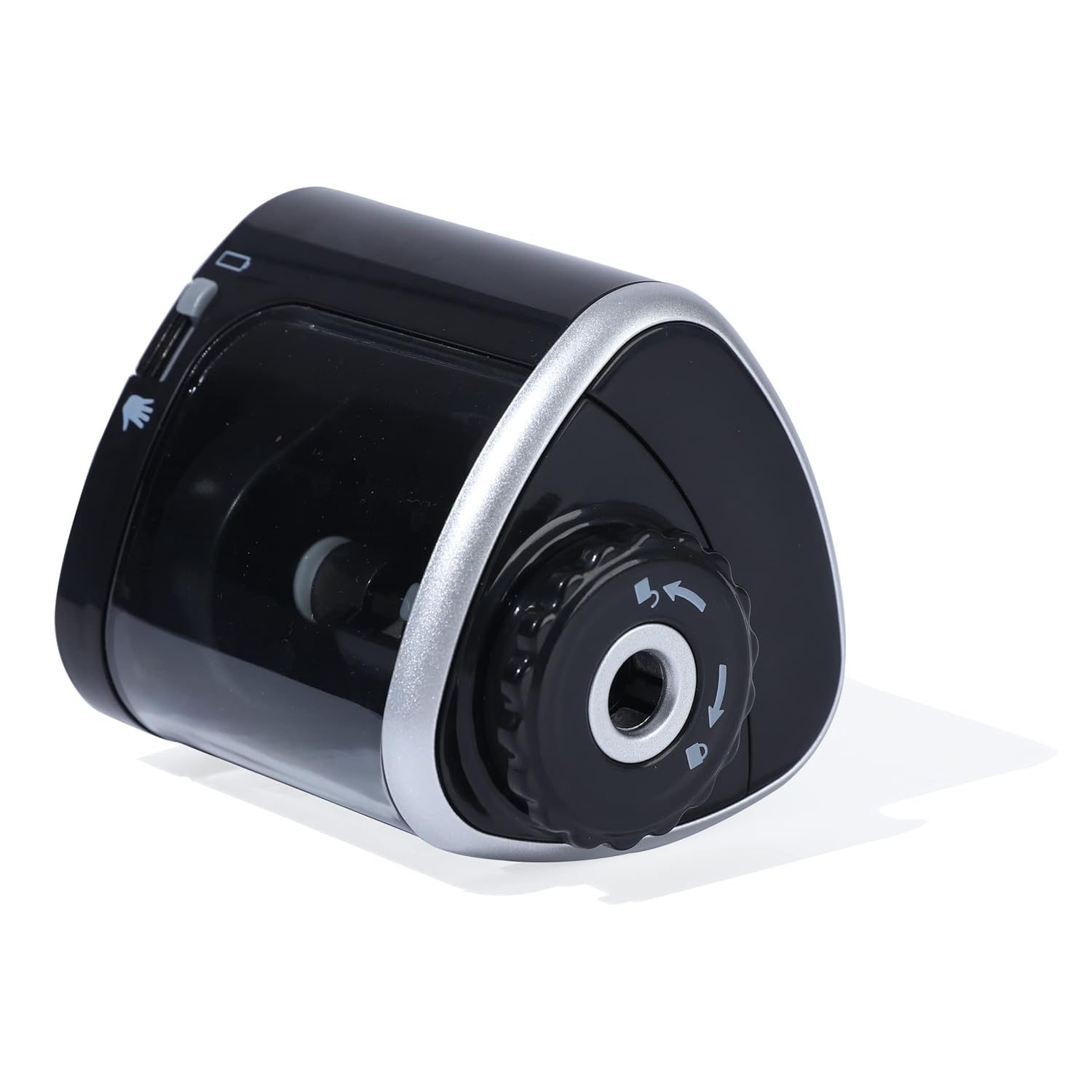 This Sharpener is driven by a small electric motor which makes the blade of the sharpener revolve around the pencil when it is inserted inside the hole of the sharpener.