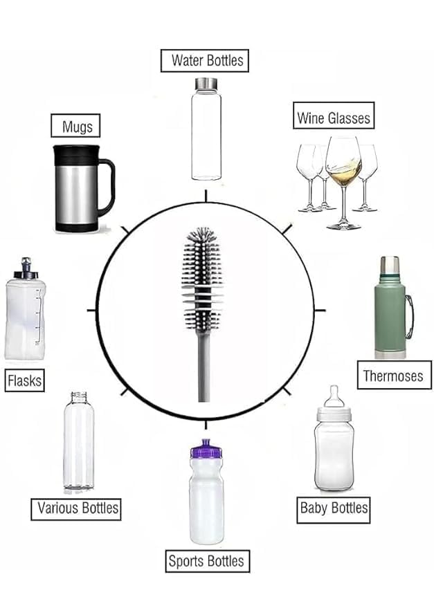 Multipurpose bottle cleaner brush suitable for cleaning steel bottles, plastic bottles, glass bottles, sippers, sports bottles, and travel mugs with effective scrubbing performance.