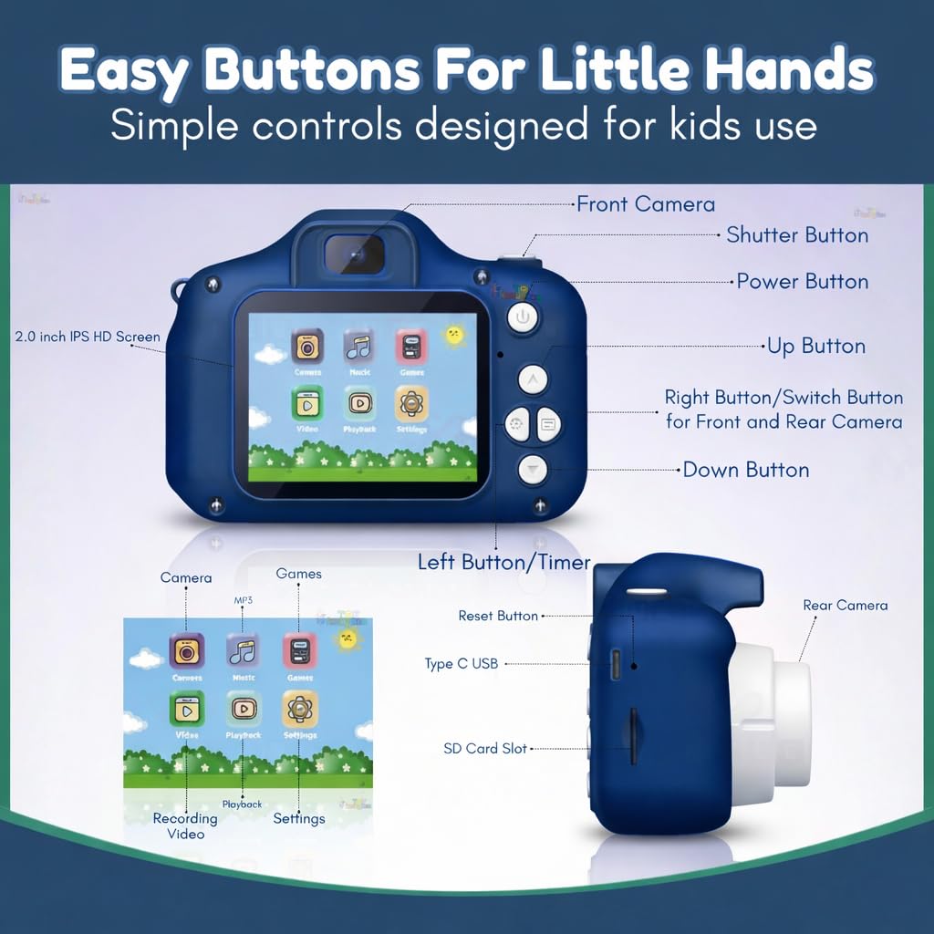 🚀 Space Theme Design with Built-in Games – Blue space-themed digital camera with built-in games such as Snake, Tetris, and puzzle games to keep kids entertained.