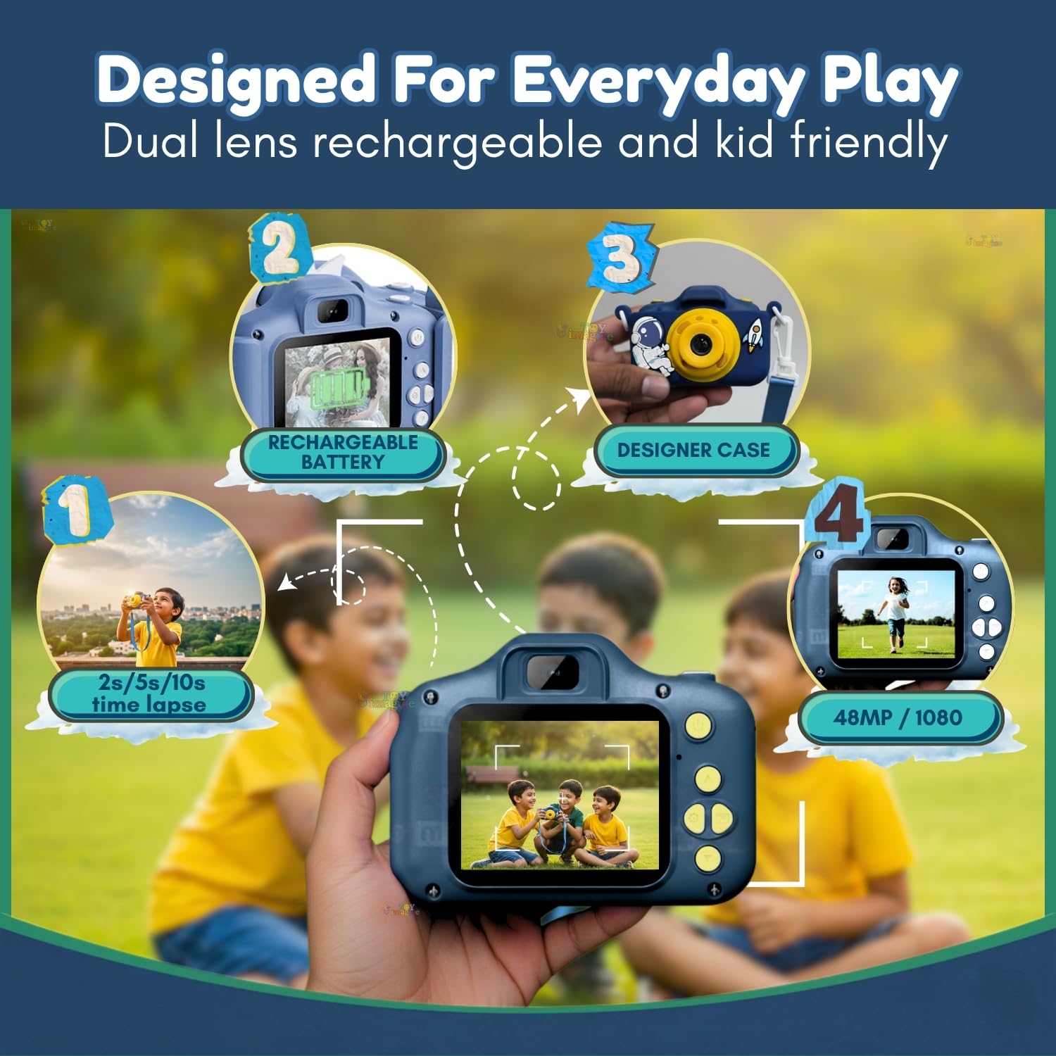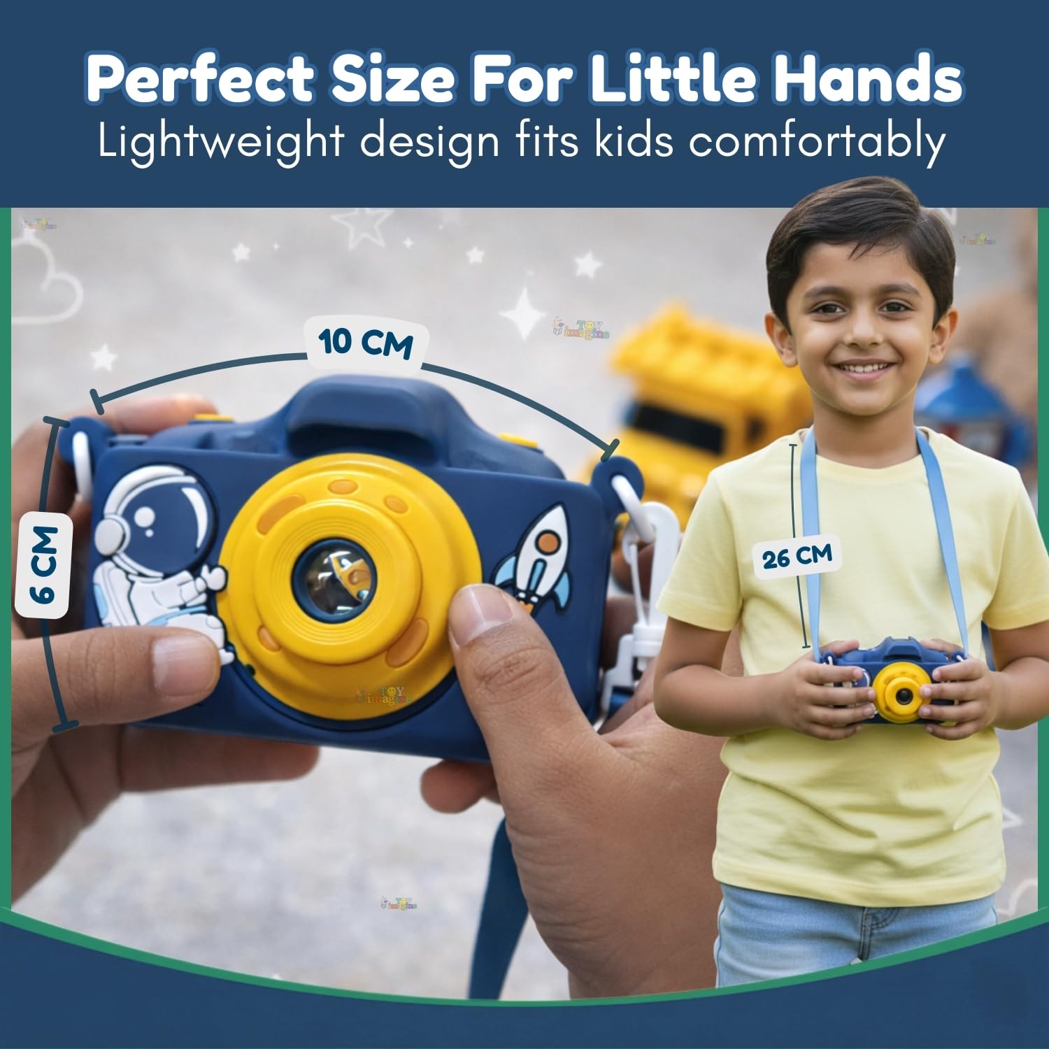 Toy Imagine Space Theme Kids Digital Camera is a fun and easy-to-use camera designed for children ages 6–12. It features 48MP photos, 1080P video recording, a 2-inch display, and front & rear cameras for creative play. The camera includes built-in games, supports OTG phone connection for viewing photos and videos (OTG cable not included), and offers extended storage support. With a 600mAh rechargeable battery, lightweight portable design, and assorted colors, it makes a cute, educational, and memorable gift for birthdays, holidays, and special occasions.